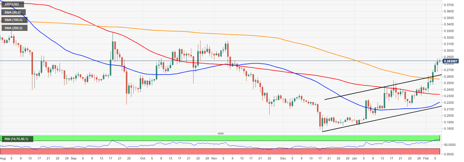 XRP/USD retreated from the recent high, though it is still trading above SMA50 1-hour at $0.2800, which is a positive signal in the short run. If this technical barrier is taken out, the sell-off may be extended towards $0.2700 with SMA100 1-hour located just below this level. A sustainable move lower will negate the immediate bullish scenario and open up the way to $0.2600 (broken channel resistance) and $0.2550 underpinned by SMA50 4-hour.