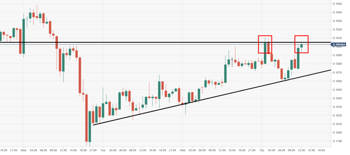 There is a risk of a near-term double top via the 60-minute chart view. The $0.1900 level is the top area.