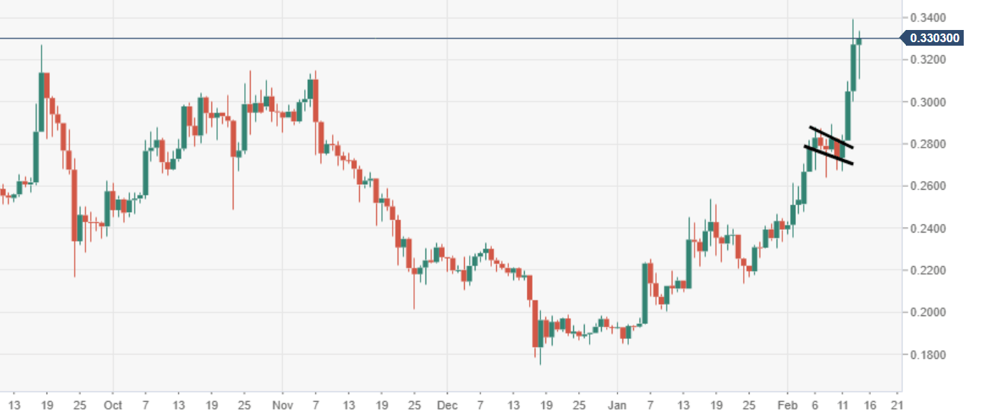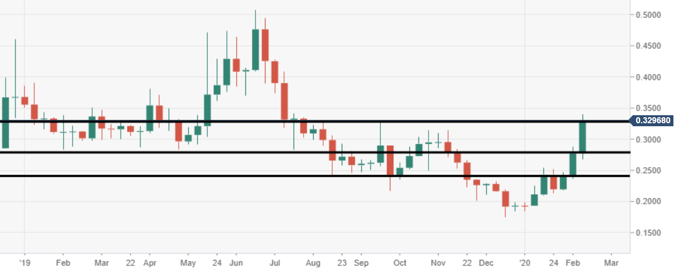 The bulls have pushed the price from depressed levels of $0.2200 up to recent highs at $0.3400 over the three weeks run higher period.