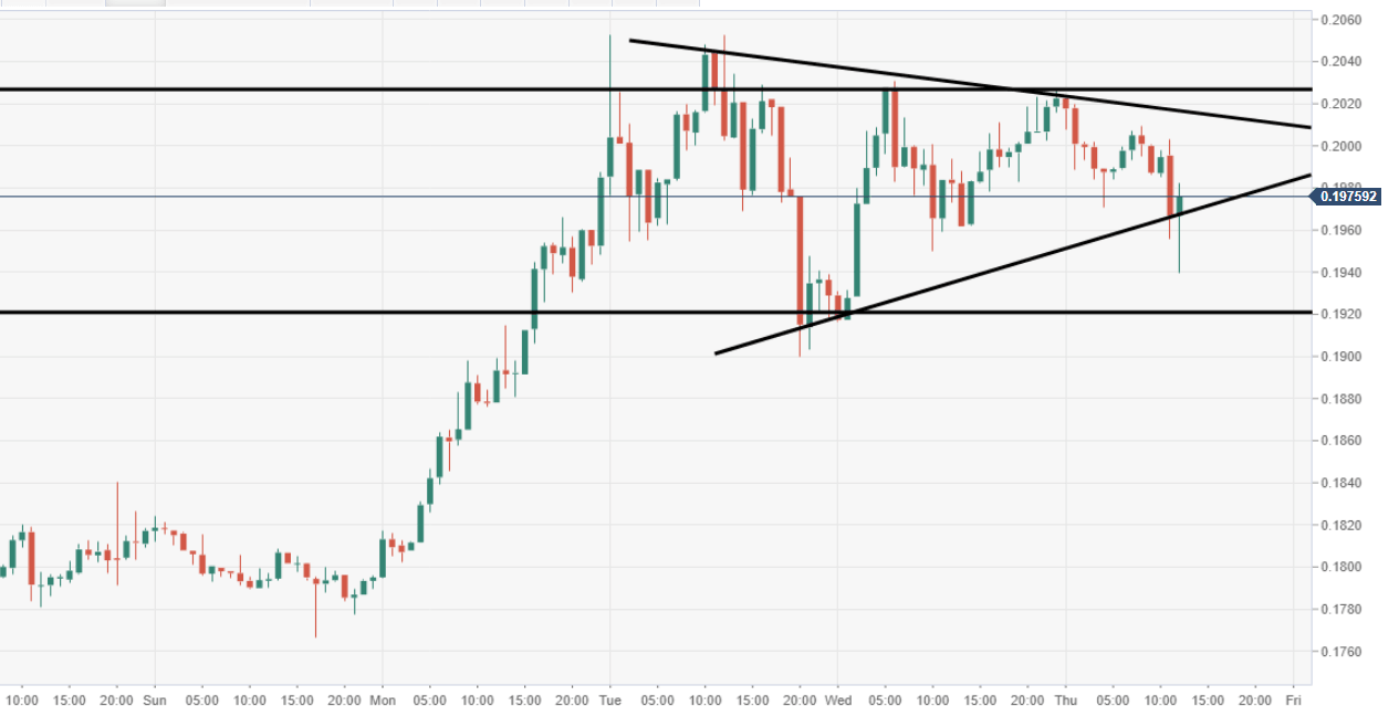 - XRP/USD is consolidating just below the big $0.2000 mark, capping upside for now.
