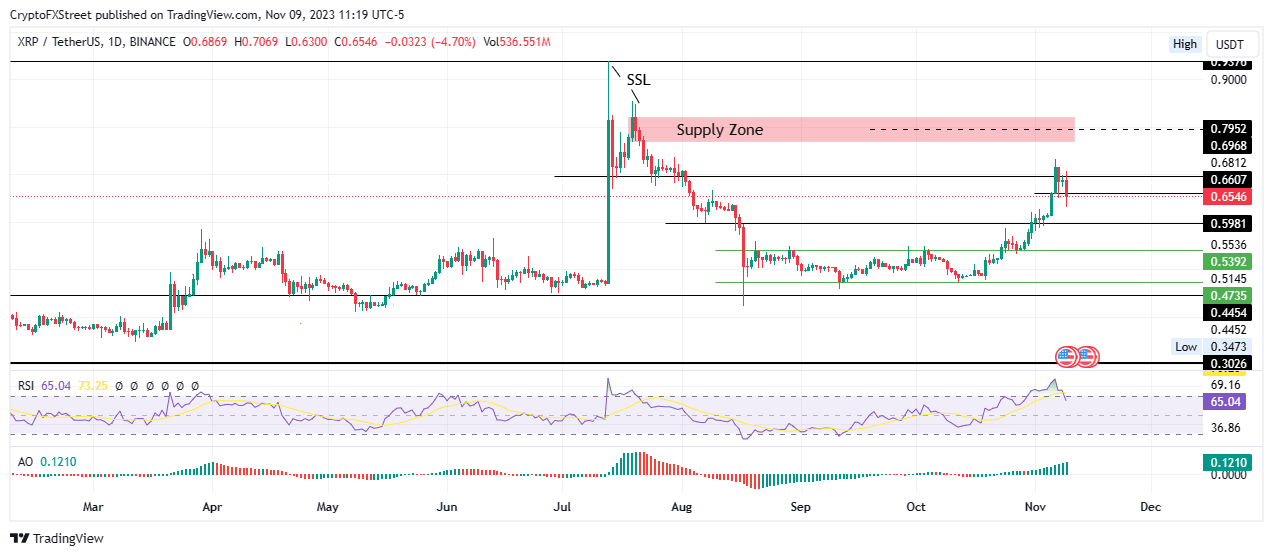 Ripple price is struggling to hold above the $0.66 support level, but this base continues to wear thin for XRP as momentum is falling fast. If this level fails to hold as a support, the price could dwindle further to test the $0.59 support level.