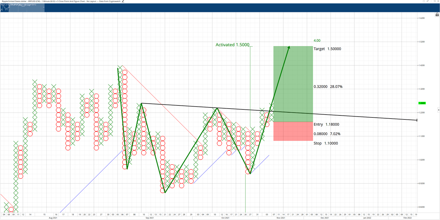 XRP price triggered a hypothetical long entry previously identified on October 28th. The original long setup called for an entry at $1.18 based on the breakout from a triple-top. In the time since that entry was triggered, two more enormous bullish events have occurred. First, XRP traded and closed above the neckline of the inverse head-and-shoulders triangle. Second, a bullish catapult has developed and points to the $1.50 value area as the projected profit target from that pattern.