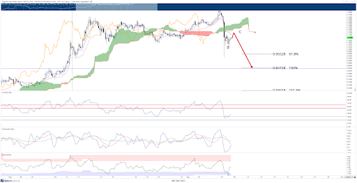 The Relative Strength Index (RSI) has bounced off the midpoint between the two oversold conditions in a bear market (20 and 30). The Composite Index has also experienced a strong bounce – note that the current low of the Composite Index is the lowest low for 2021 on the 4-hour chart. This could be a leading indicator of further downside pressure.