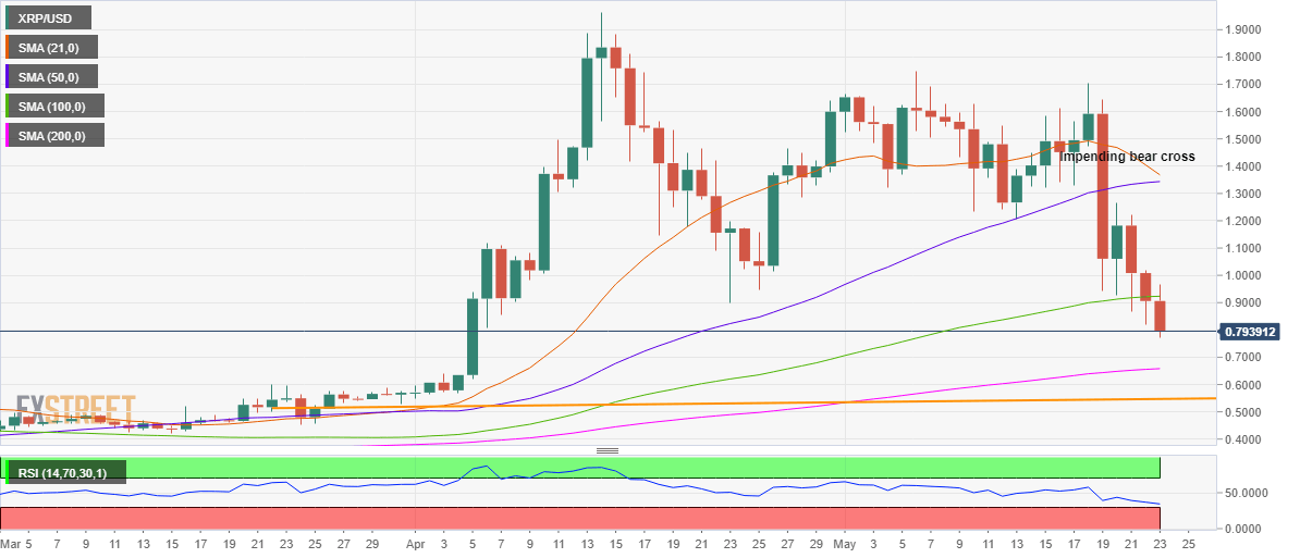 The XRP price is witnessing another leg lower this Sunday, having closed Saturday below the mildly bullish 100-day simple moving average (SMA) at $0.9234.