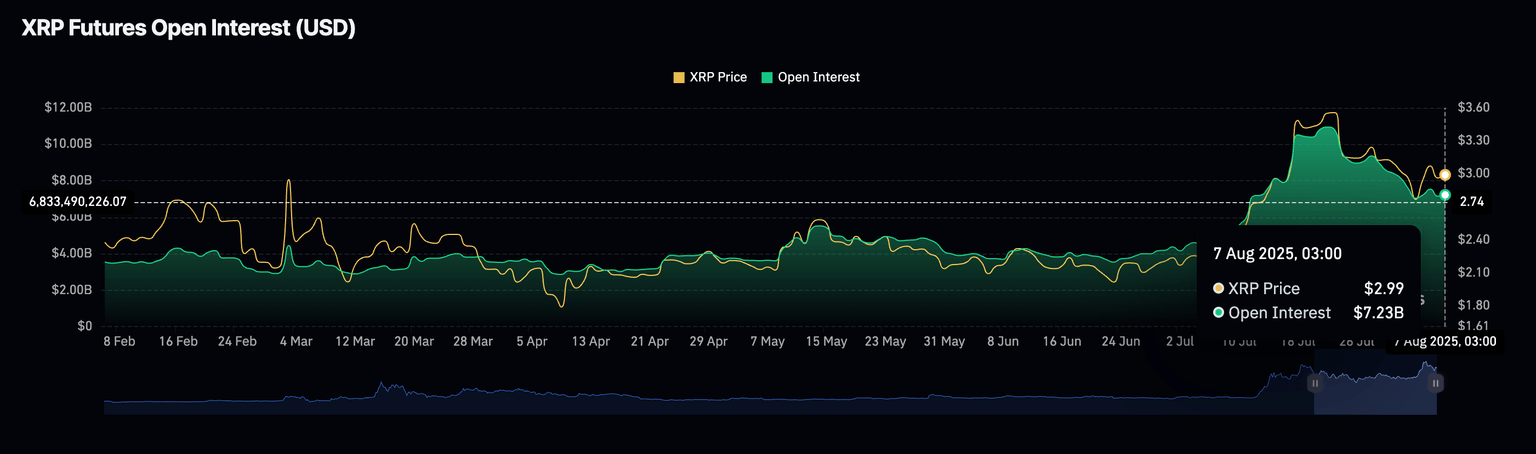 Interest in XRP remains relatively subdued, considering the futures Open Interest (OI) has declined by more than 34% to average at $7.23 billion from its July peak of $10.94 billion.