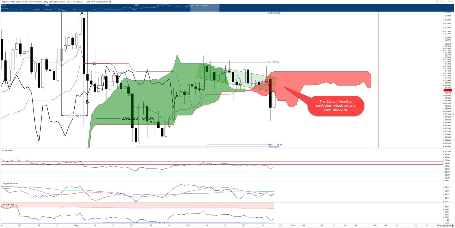 XRP price falling below the 2021 Volume Point of Control was the first significant sign that selling pressure was likely to take over during the Wednesday session. The pressure on the short side of the market was compounded when XRP and closed below both the Cloud and the bull flag. The road to lower prices is clear, but XRP could easily trap short-sellers if it closes above some key levels.