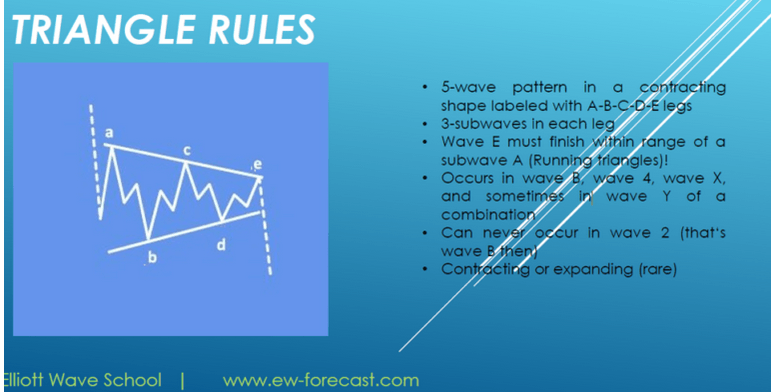 Corrective pattern with converging trendlines, subdividing 3-3-3-3-3 and labeled A-B-C-D-E. Occurs in wave 4, B, X or Y wave.