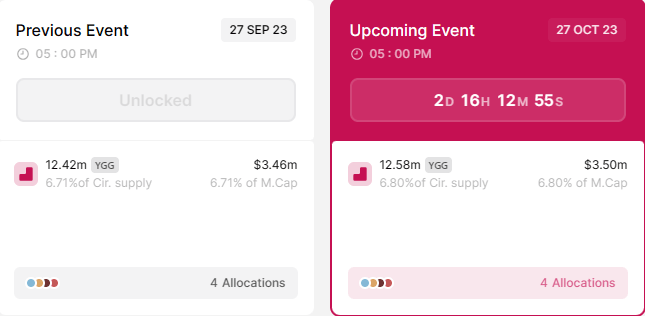 Meanwhile, YGG community members are bracing for the cliff token unlocks event scheduled for October 27. The event will see 12.58 million YGG tokens worth approximately $3.50 million to the market.