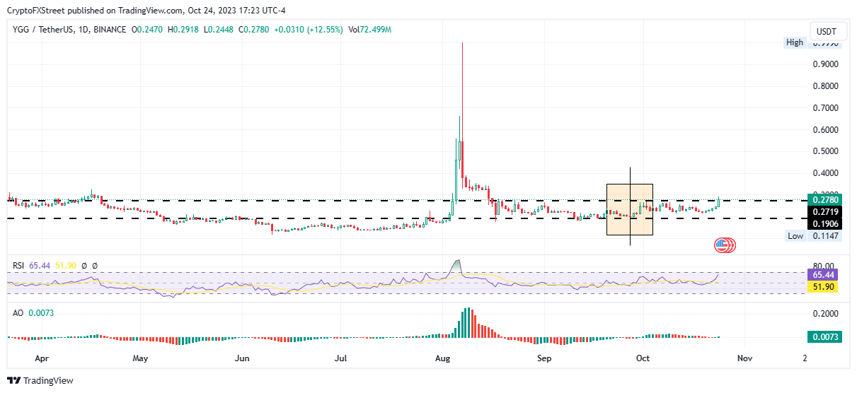 Based on the Relative Strength Index (RSI) indicator, momentum is rising that could see YGG price escape the upper boundary of the range at $0.2719. In a highly bullish case, the gains could extend for Yield Guild Games to tag the $0.4000 psychological level. The Awesome Oscillator (AO) is also in the positive territory, showing bulls are leading the market.