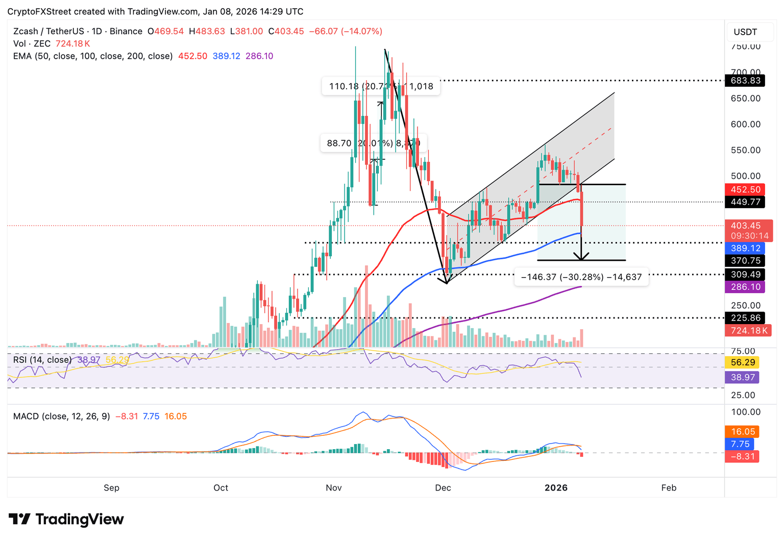 ZEC currently holds below the 50-day Exponential Moving Average (EMA), which caps the upside at $452, while the 100-day EMA provides support at $389. After a sharp decline, the Relative Strength Index (RSI) holds at 39, suggesting bearish momentum is increasing.