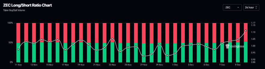 Additionally, Coinglass’s long-to-short ratio for ZEC reads 1.08, the highest level over a month. The ratio above one suggests that more traders are betting on Zcash’s price to rally.