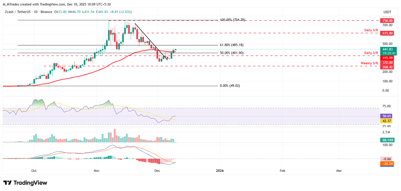 Zcash price broke above the descending trendline (drawn by connecting multiple highs since November 20) on December 5. Still, it failed to sustain the upward momentum and declined the next day, finding support around the trendline. On Monday, at the start of the week, ZEC rose by over 19% and continued to climb through Tuesday. At the time of writing on Wednesday, ZEC continues its gains, trading above $440.