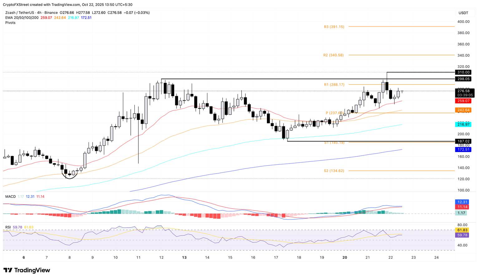 Zcash edges higher by 4% at press time on Wednesday, bouncing off the 20-period Exponential Moving Average (EMA) on the 4-hour price chart. The imminent resistance for the privacy coin is at the $298 level, marked by the October 11 high.