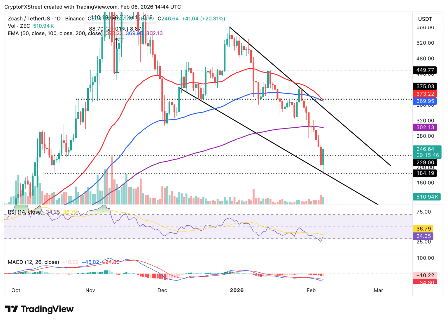 The area between $230 and $240 is poised to absorb selling pressure amid possible profit-taking from investors who may have bought ZEC at intraday lows. The demand zone at $185 is still within reach unless ZEC steadily rises and reclaims the 200-day EMA as support.