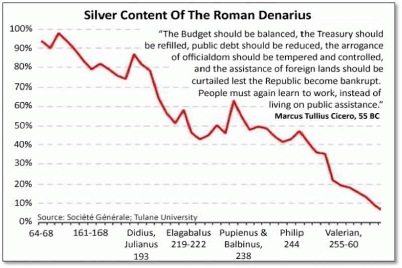 To illustrate the importance of the former, I present this chart showing the depreciation of the Roman denarius silver coin through the history of the empire: