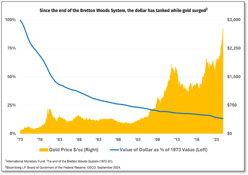 In the 60 years after the removal of silver from our coinage, the CPI grew 10-fold, from 31.6 during the summer of 1965 to 317.8 at its last reading, in March 2025. The dollar is down 98.9% to gold.