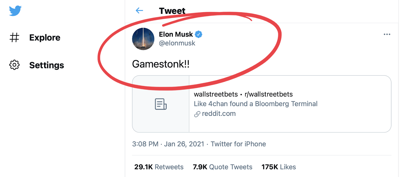 Musk, who has clashed with Tesla shorts in the past, tweeted a link to the Reddit thread, saying “Gamestonk!”