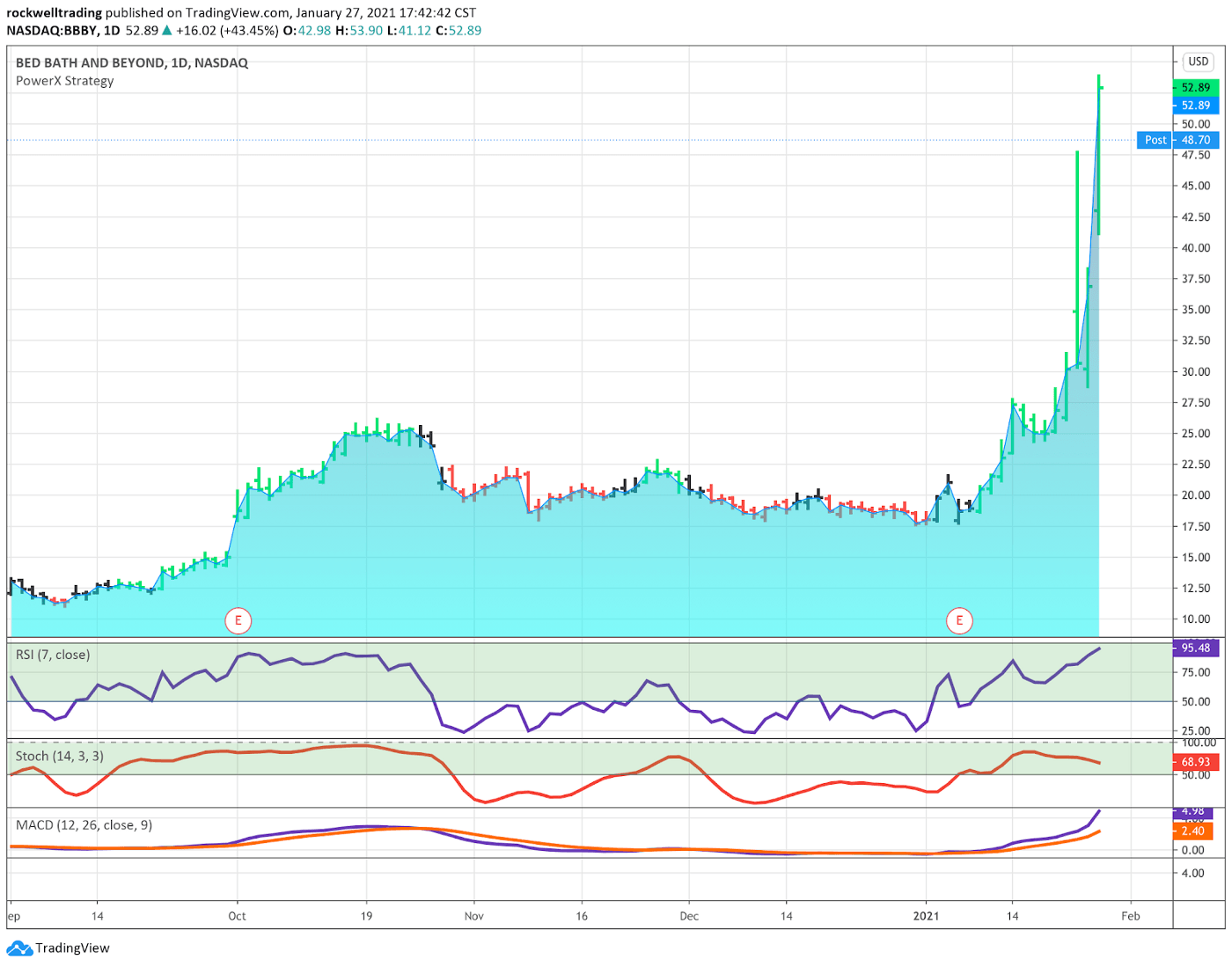 Next is Bed Bath & Beyond (BBBY). It traded as high as $53.90 yesterday — its highest level since 2015! Right now, BBBY closed up 24% at $45.79.