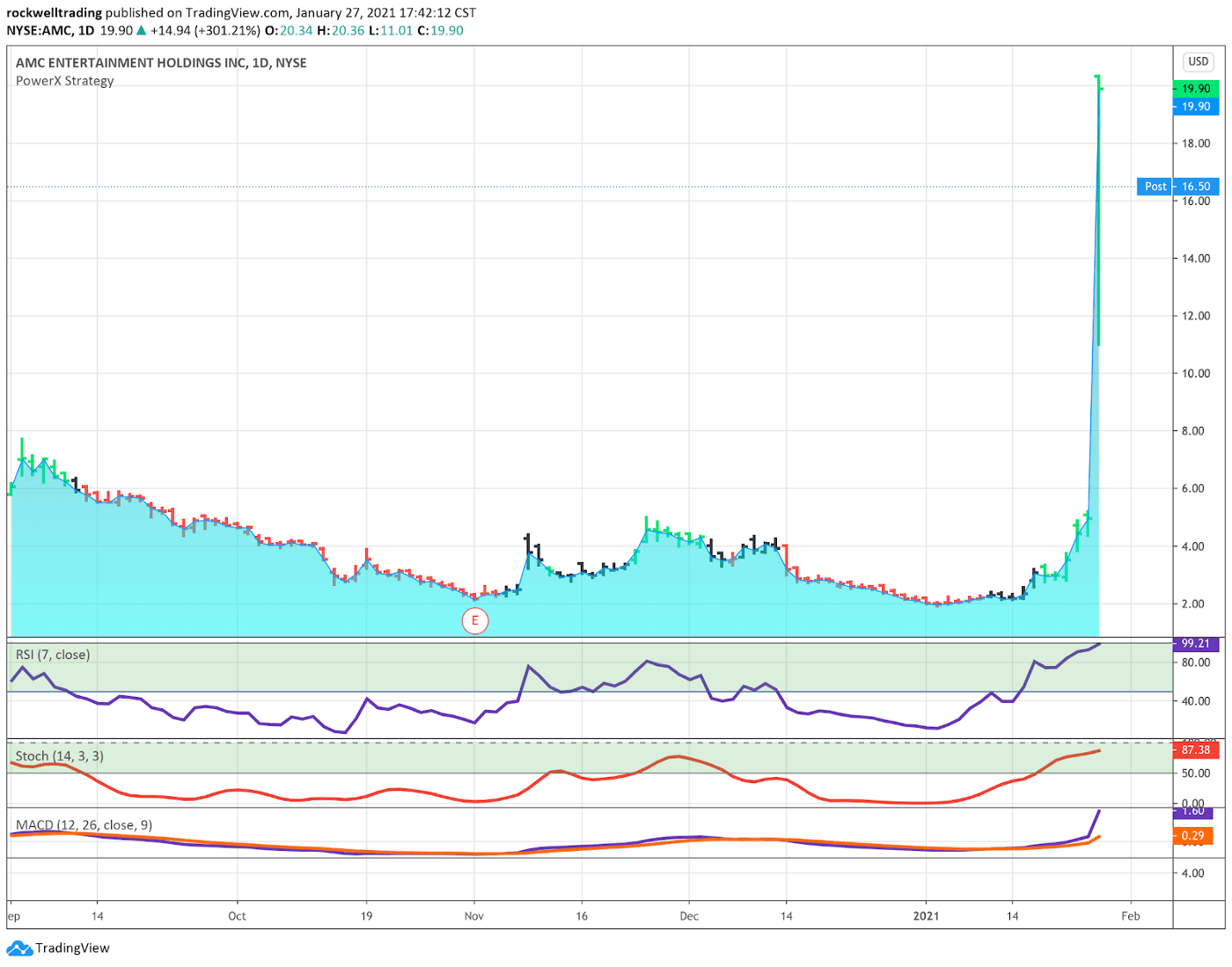 First up is AMC (AMC). On Tuesday, the 26th, they closed at $4.96, and hit a high of $20.36 earlier. Yesterday they were up 229% at $16.27.