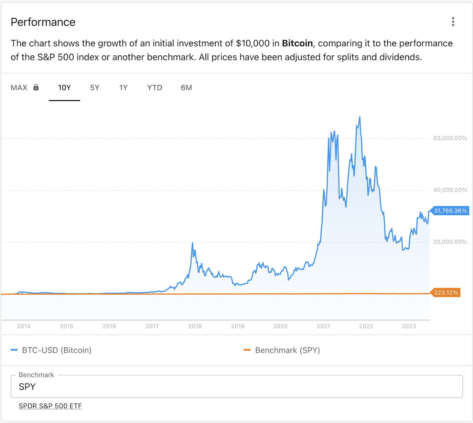 Investing in cryptocurrencies can offer various benefits, including portfolio diversification and alternative options to traditional financial institutions. While it's important to note that past performance is not indicative of future results, Bitcoin has demonstrated impressive growth compared to the S&P 500 over the past decade. BTCUSD has seen an annualized growth rate of over 48% in the last ten years, outperforming the widely used benchmark index, which achieved 8% growth during the same period.