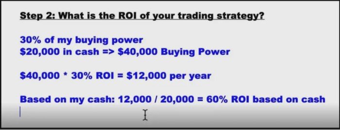 Let’s say I were to put $20,000 in cash in this account. $20,000 in cash into a margin account would give me $40,000 in buying power, so back to my ROI, the return on investment.