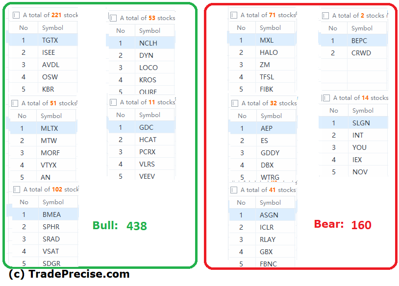 The bullish setup vs. the bearish setup is 438 to 160 from the screenshot of my stock screener below pointed still a positive market environment with no shortage of the trade entry setup.