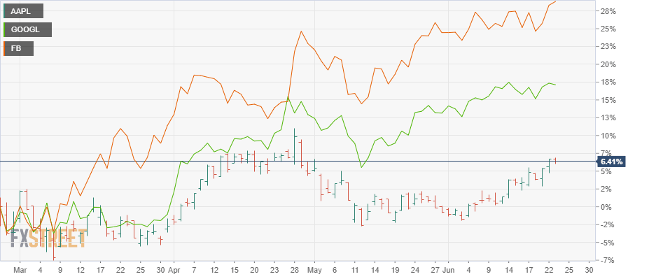 Apple shares continue to push toward fresh record highs and follow in the footsteps of other FAANG names such as Facebook (FB). The social media giant again set record highs on Wednesday, while AAPL shares have been lagging behind. AMZN remains within touching distance of record highs, and Alphabet (GOGL) also set new highs on Wednesday. The chart below compares AAPL, FB and GOOGL shares.