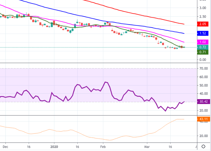 At the moment (pre-market), the stock is losing 0.14% at 0.716 and a breach of 0.60 (2020 low mar.19) would open the door to 0.34 (monthly low Aug.2016) and finally 0.32 (monthly low Jul.2016). On the flip side, the next hurdle is located at 0.81 (high Mar.23) seconded by 0.84 (weekly high Mar.20) and then 1.06 (21-day SMA).