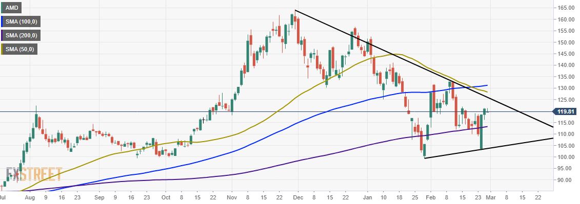 Advanced Micro Devices (AMD) open lower on Monday, down $1.3% at $119.55. AMD shares were trading 2.4% lower in the premarket as major indices are down across the board due to increased uncertainty regarding the Russia-Ukraine war. NASDAQ futures are down 1.4% at the time of writing.