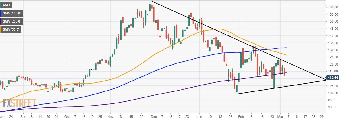 The wedge that formed on the daily chart due to February 24's $103 low and the top descending trendline that began on November 30 converge at a $109 apex. AMD stock needs to close above approximately $122 to break out of this wedge.