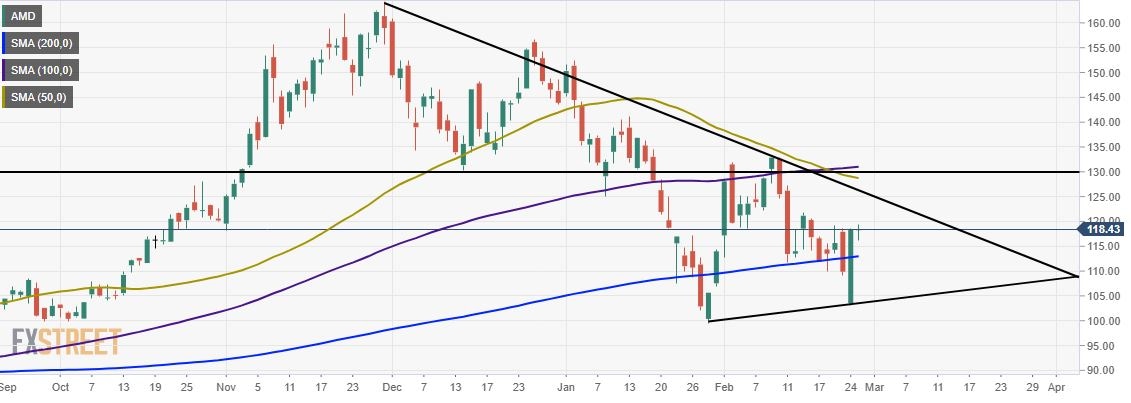 Advanced Micro Devices (AMD) opened on Friday up about 1.2% near $118. The stock fell victim to a rollercoaster ride on Thursday alongside most of the market after Russia invaded Ukraine, with AMD shares trading down to $103 and then closing at $116.61. The stock is trading inside a wedge formation.