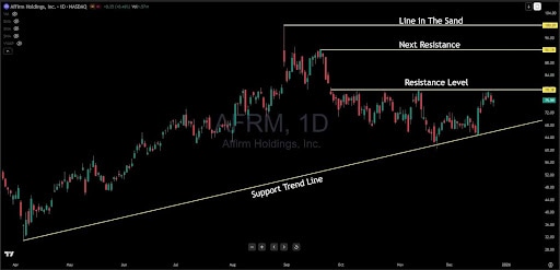 If AFRM can clear that first resistance trendline, the chart already lays out the next stages of the move with two overhead levels: Next Resistance in the low‑90s and a Line in The Sand near the 100 area. The low‑90s zone lines up with prior price congestion and represents the next likely area where profit‑taking could emerge after a breakout. Think of it as the second step in a staircase: once price climbs above the initial ceiling, this is the next rung where the stock may pause or consolidate.