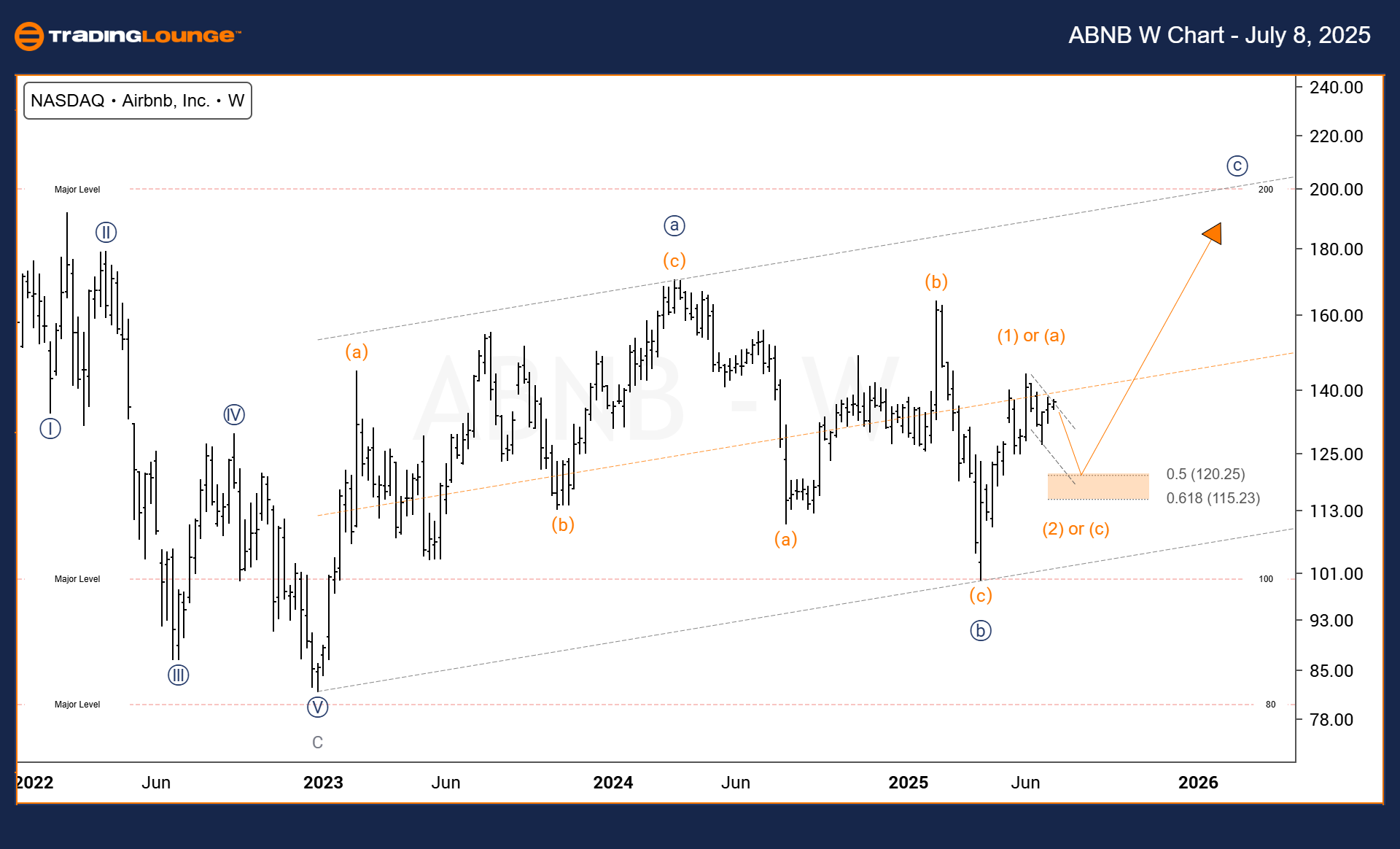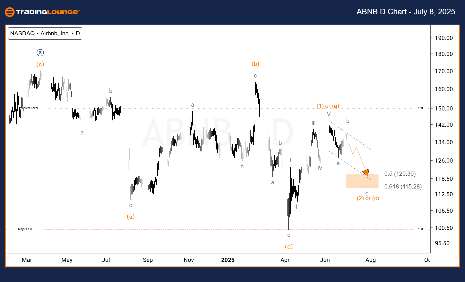 Airbnb's weekly chart presents a broader corrective structure. Currently, the stock is progressing through Wave (2) of {C}, targeting classic retracement levels—50% and 61.8% of the prior Wave (1). This correction suggests a potential base formation in the near future.