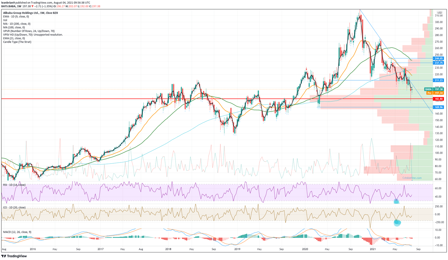 The daily chart gives us some short-term resistance levels, the first being the 9-day moving average at $199.17, close to the $200 psychological level. Most of 2021 has seen BABA in a near-perfect down channel and the recent dump lower to $180 worked well here. This coupled with the volume profile on the weekly chart shows just how good a support $180 was. The top of the channel corresponds to the $217 resistance mentioned.
