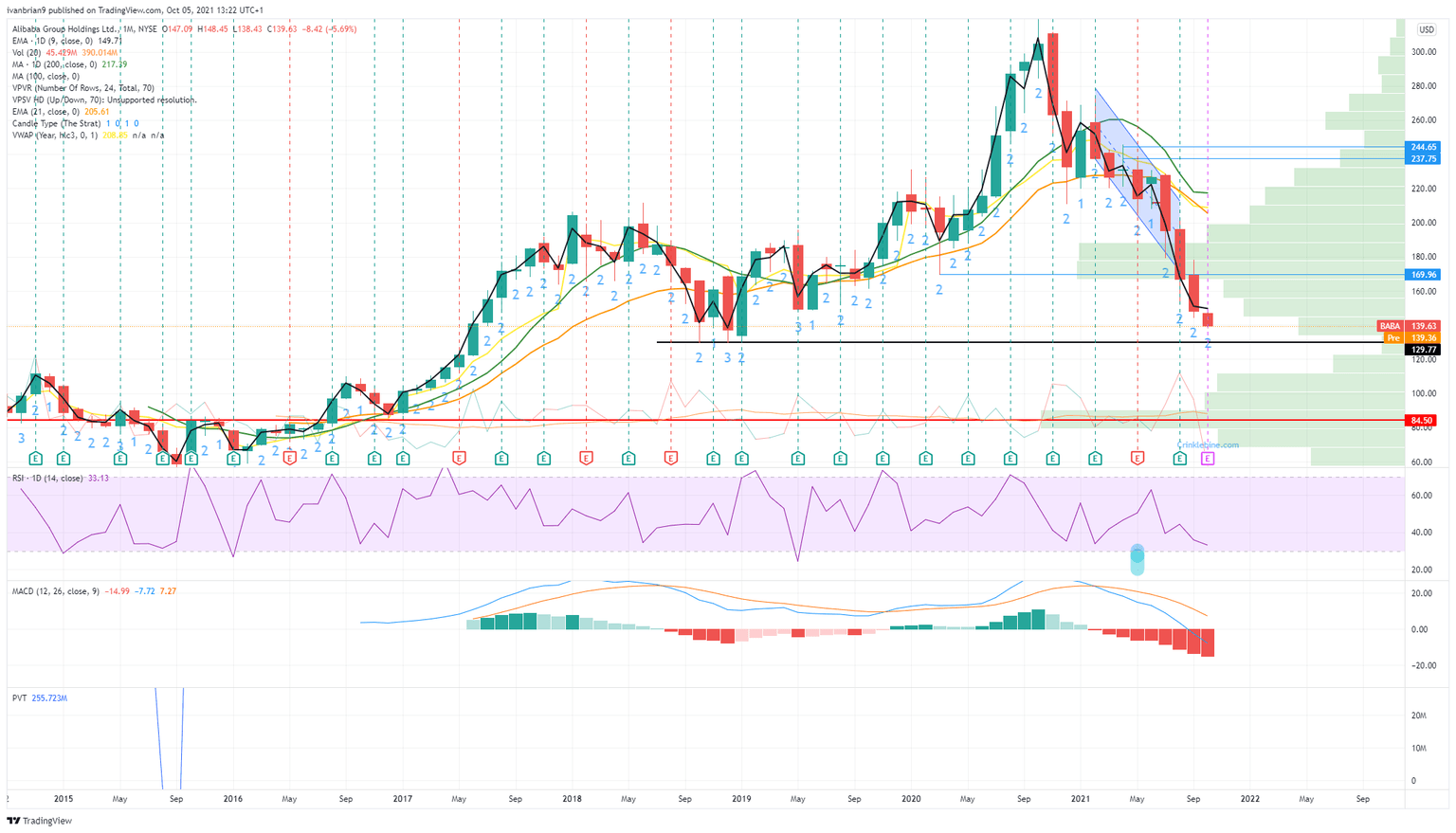 We really need to take a step back and look at the monthly chart for this one given where the stock has fallen to. There is potentially some hope at $129.77 with support there from the lowes back in July 2018. Alibaba (BABA) stock made several attempts to break the level before going on a huge rally. Given the volume profile bars on the right of the chart, we would prefer if Alibaba (BABA) did not even get to test that support, as once below $134 volume drops off sharply and a volume vacuum can often lead to a price vacuum. That would leave $100 as the obvious psychological support. Volume does indeed pick up there.