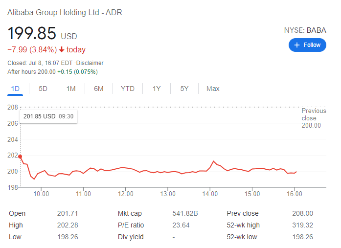Update July 7: Alibaba Group Holding Ltd - ADR (NYSE: BABA) closed Thursday in the red amid a prevalent risk-off mood. The share lost 3.92% on the day, settling at $199.85, not far above a daily low of $198.26. Demand for high-yielding assets plummeted on signs of slowing global growth. Speculative interest turned to government bonds, with the yield on the 10-year US Treasury note falling to 1.25%, its lowest since last February.