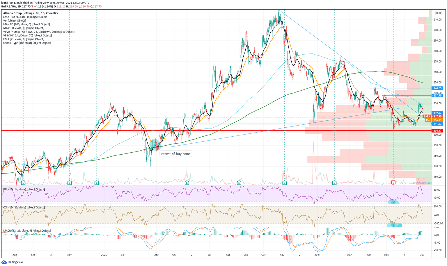 Update July 9: Shares in ALibaba slumped again on THursday as concerns from the DIDI case caused investors to rethink investment strategies in a number of Chinese and Chinese related stocks. BABA had been the subject of Chinese regulatory scrutiny earlier this year and that is still not resolved with its ANT group subsidiary. Thursday saw BABA slip below the support at $204.39 and break the psyschological $200. The shares closed at $199.85