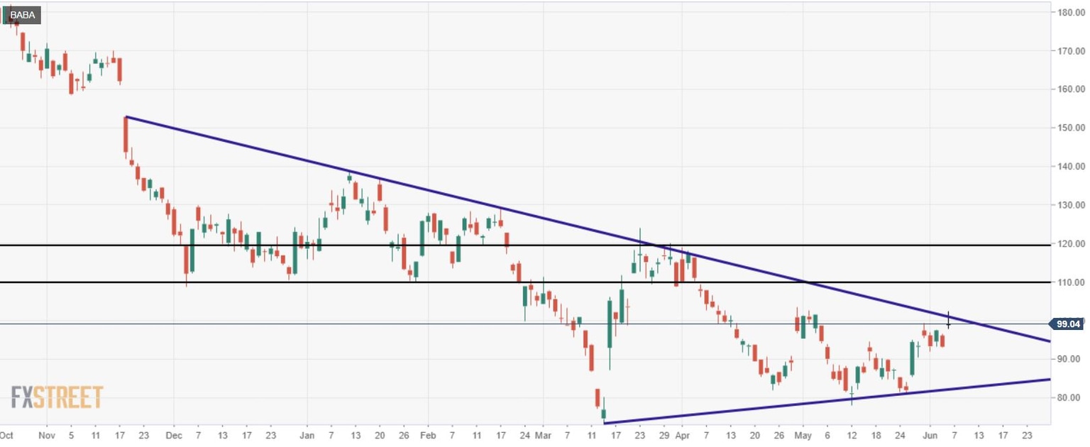 Update: BABA stock added 5.34% on Tuesday, up roughly 12% ever since the week started, ending the day at $104.32 per share. Wall Street closed with substantial gains, despite lingering risk-aversion. The Dow Jones Industrial Average added 264 points, while the S&P 500 advanced 0.96%. As for the Nasdaq Composite, the index settled at 12,179 up 0.94% or 113 points. Easing government bond yields helped equities to recover some of the ground lost at the beginning of the week, although gains were limited by continued recession-related concerns. Fears that the US economy may suffer a recession were a report from the World Bank, downgrading this year's global growth forecast from 4.1% to 2.9%.