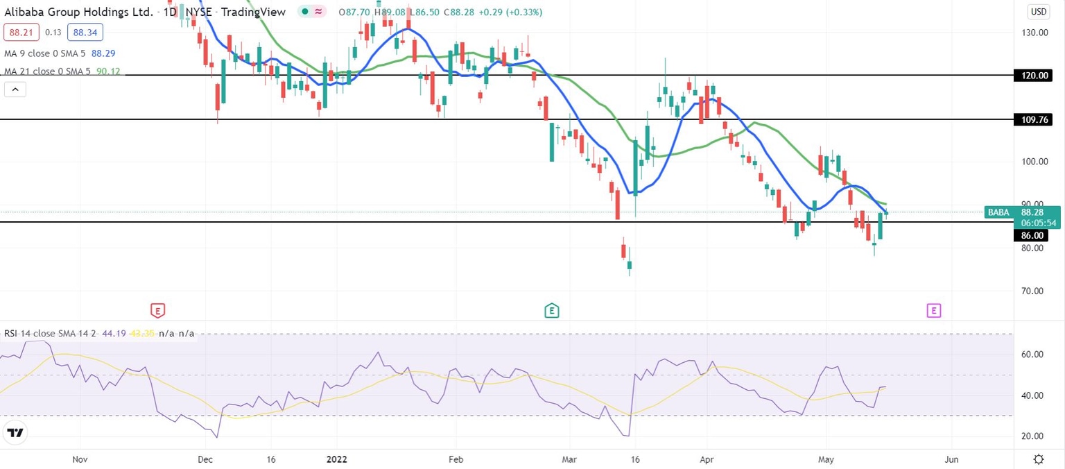 If sentiment changes for the better, bulls need to conquer the $100 psychologically important level and resistance at $109.76 before moving on to $130. Additionally, the last range high at $120 may provide resistance as well. Support remains at the March 15 low of $73.28. Until $109.76 is broken, it is hard to view BABA with any kind of bullish gaze.