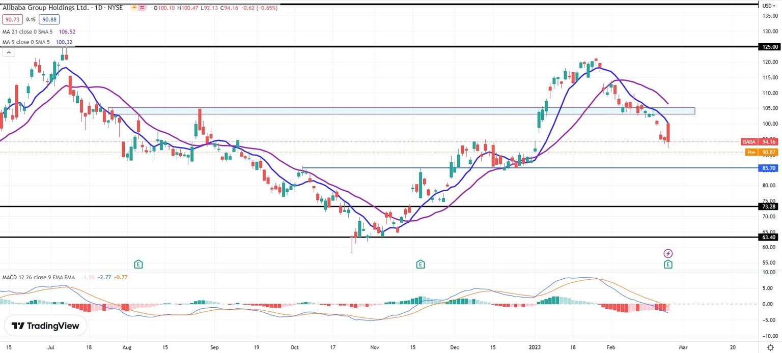 Alibaba (BABA) stock has lost another 3.6% to trade at $90.80 in Friday's premarket on the back of a higher than expected inflation reading for the US economy. The Personal Consumption Expenditure (CPE) index came in hot an hour before the stock market opened in New York. The MoM reading for January was up 0.6%, 50% higher than the 0.4% reading that was expected.
