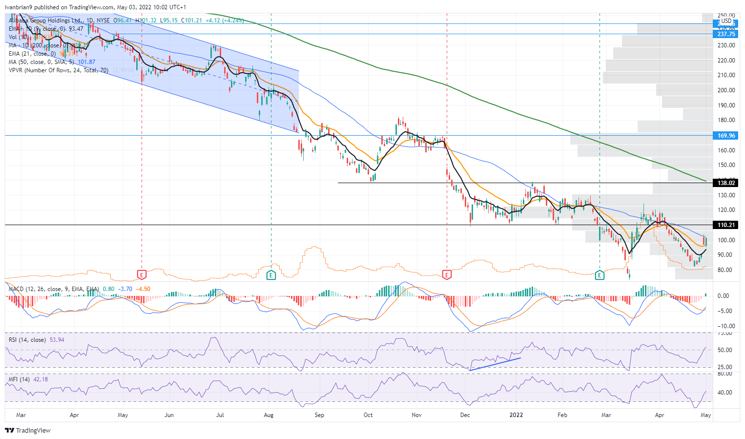 BABA stock price has for now also set a higher low than previous. So, this $81.80 low is our short-term pivot. $110 and then the March high at $124 are important resistance levels to break.