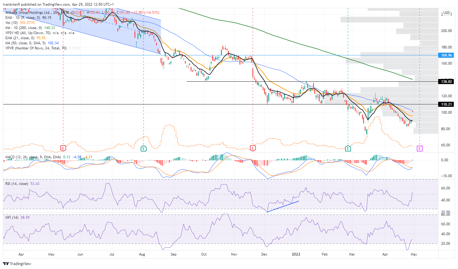 $110 is still the level BABA shares need to get above to begin to change the current bearish narrative. That will put BABA stock in a neutral set-up, only breaking $138 would put it back to a bullish trend. So quite a bit of work still to do. Both MFI and RSI gave oversold signals earlier this week when BABA dipped to $83.10 so let's see how that signal continues to play out, so far working well.