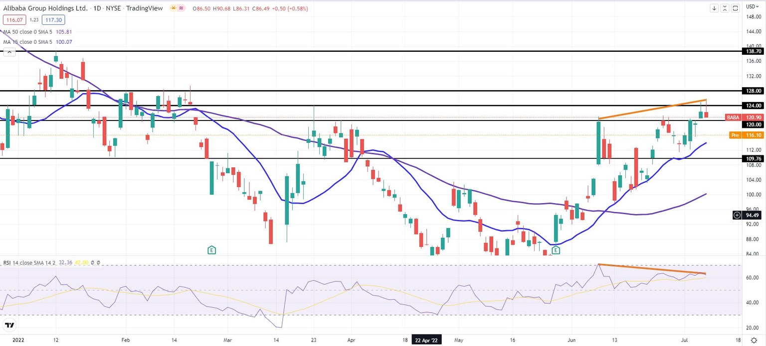 Besides $124 and $128 guarding the door, however, divergence on the Relative Strength Index (RSI) forecasts a turn for the worse. As can be seen by the orange lines on the price chart and RSI chart, BABA share price saw a higher high between June 8 and July 8, while the RSI over the same period failed to make a new high. Typically, this a leading indicator that a reversal is about to commence. Be warned!