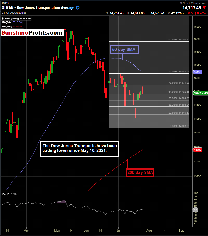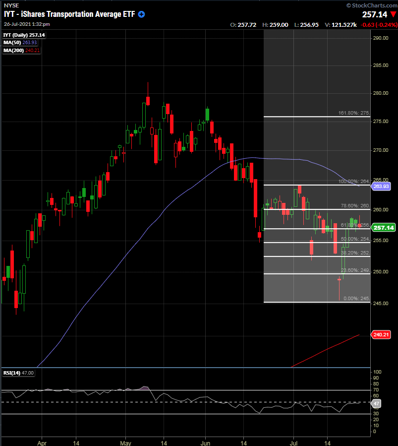 Transports have been weak, and today the index traded up to and touched the 78.6% Fibonacci retracement level from its July 1, 2021, high to its July 19, 2021 low. What is going on with the transports?