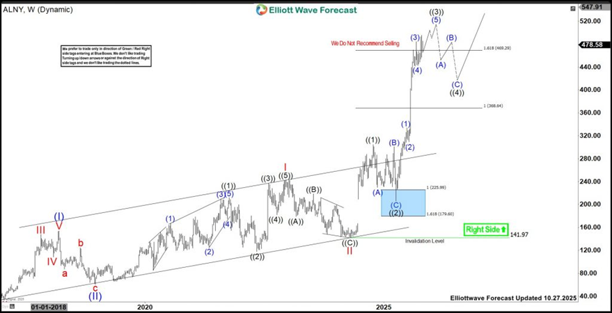 As discussed in the last article, ALNY ended (4) pullback at $442.51 low & resume higher in (5). It favors rally in (5) towards $494.95 – $511.13 area as minimum extension to extend April cycle. It already reached the minimum level expected in last article, so chasing rally is risky now. But we like to buy the next correction in ((4)) at extreme area, when reach against April-2025 low.