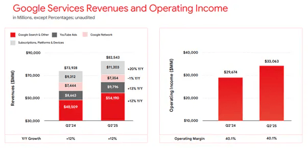 Google Cloud was the standout performer this quarter. Revenue climbed to $13.6 billion, up 32% year-on-year and ahead of the $13.1 billion consensus. The number of Cloud deals over $250 million doubled, and Alphabet signed as many as $1 billion+ deals in the first half of 2025 as it did in all of 2024. Operating income hit $2.83 billion, further establishing Cloud as a profitable growth driver.