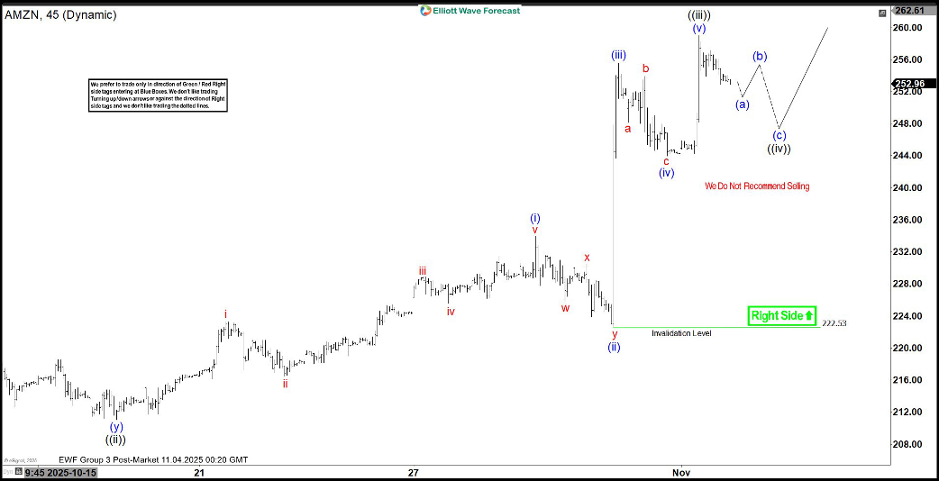 The Short-Term Elliott Wave outlook from the October 11, 2025 low remains constructive, unfolding as a five-wave impulsive structure. From that low, wave ((i)) advanced and concluded at $222, followed by a corrective pullback in wave ((ii)), which bottomed at $211.03, as illustrated in the 45-minute chart. Subsequently, the stock began nesting higher within wave ((iii)), suggesting a bullish continuation.