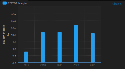 However, we are less than confident in the consensus, and in the table below we have outlined the EPS based on margins remaining constant and a worst-case scenario. Even if margins remain the same and revenue forecasts prove accurate, that implies a 12-month EPS of $1.64. Amazon is currently trading on 50 times earnings, so $1.64 X 50 gives us a target of $82. Gross margins and EBITDA margins have been flatlining or declining as the two charts below illustrate. Forecasting then gross margins to remain flat looks conservative given what is happening to energy and the dollar.