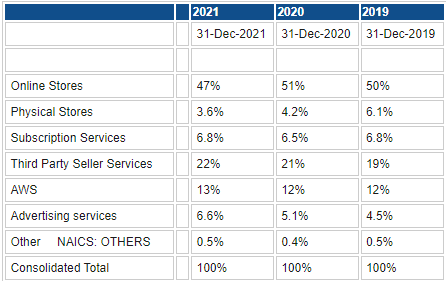 Ecommerce is the main driver of sales at Amazon with nearly 50% of revenues coming from this segment.