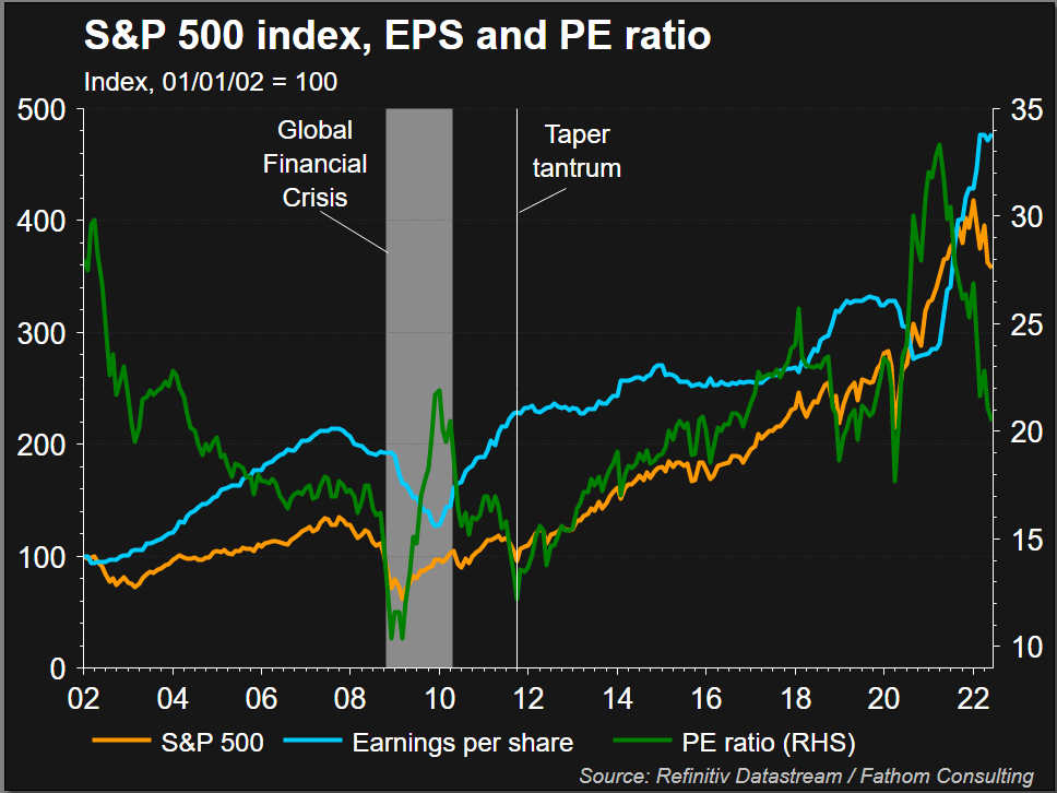 Regular readers of our deep dives will know we have outlined that the average bear market lasts one year and sees a decline of approximately 40% for the main equity index – the S&P 500. Without a recession though, that average decline moves closer to 30%. Recently, we have done some further analysis to reinforce the probability that we may be closer to the bottom. Excluding 2000's DotCom bear market and the 2008 financial crisis sees the average bear market running at about a 30% decline, irrespective of whether or not the US economy goes into recession.
